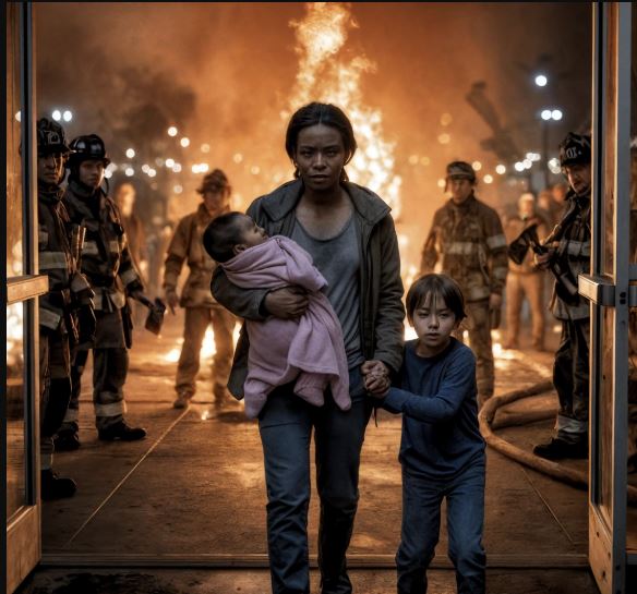 Ogni rampa suonava come latta battuta. Gli allarmi ululavano. Due piani più giù, voci di pompieri, ordini, getti d’acqua. Aisha non si voltò. La porta del pianterreno si aprì con un colpo e la strada esplose in un coro di grida. Dalla nube, una figura: la ragazza con i vestiti bruciacchiati, i capelli umidi di sudore, una neonata in un braccio e il figlio del miliardario aggrappato all’altro.