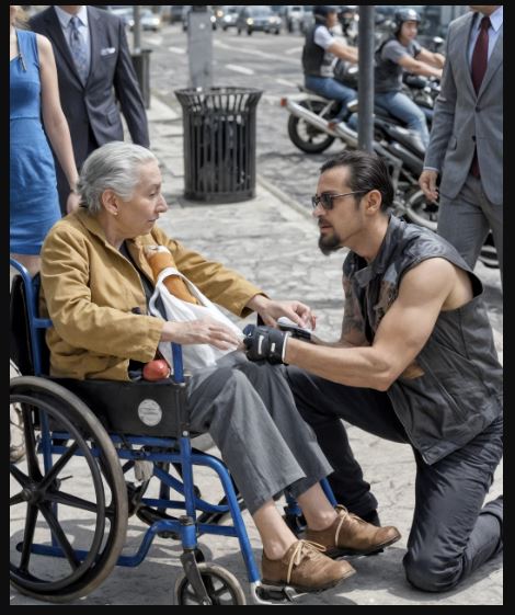 Fu un uomo con un gilet di pelle, le braccia coperte di tatuaggi e i guanti consumati dalle corse. Si è inginocchiato sul selciato — senza fretta, senza sbuffare — e mi ha allacciato le scarpe con la delicatezza con cui si sistema un nastro di seta.