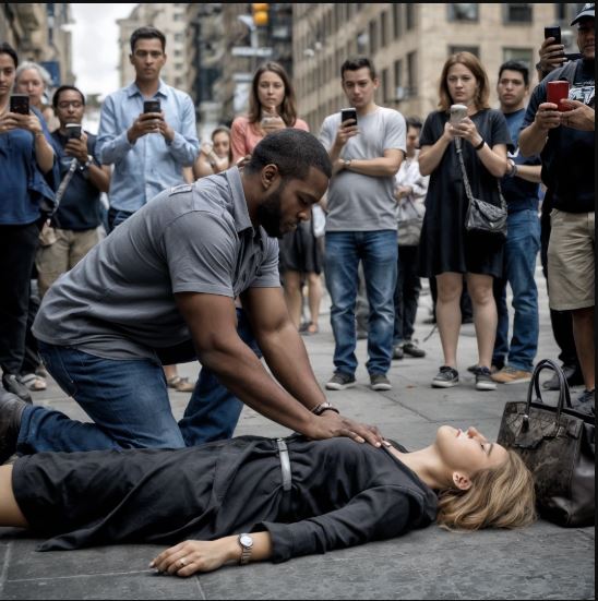 Un uomo armeggiò con il telefono, altri si fecero da parte. Per James, però, il resto scomparve: niente traffico, niente sirene in lontananza, niente sguardi curiosi. Solo il ritmo ostinato delle sue mani e la speranza disperata di far ripartire quel cuore fermo.