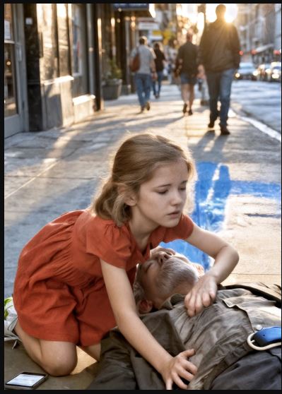Amelia sobbalzò quando sentì il tonfo secco del corpo di Thomas contro il cemento surriscaldato. Si voltò di scatto, le sue trecce bionde che le saltellavano sulle spalle, e lo vide stendersi a terra. Gli altri continuarono la loro corsa: telefoni all’orecchio, sguardo fisso lontano. Ma per lei, in quell’istante, tutto il mondo si ridusse a quell’uomo immobile.