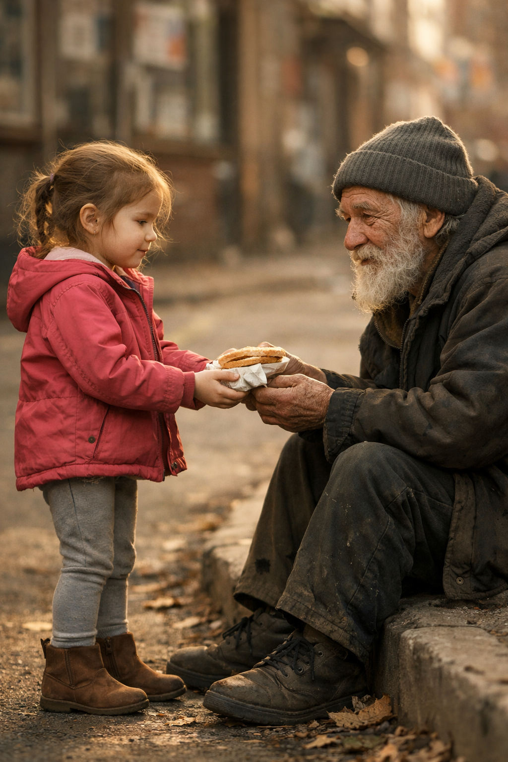 «Sembrava molto, molto affamato, papà», rispose la bambina semplicemente, senza ombra di dubbio o rimprovero nella voce. «Aveva degli occhi così gentili, ma molto stanchi. E gli tremavano le mani. Ho pensato che il mio panino potesse aiutarlo un po’, perché io avrò tanti altri pranzi gustosi, e lui potrebbe non avere nulla.»